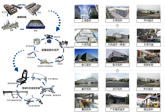 集团公司初创于2003年,以经营消费电子相关的模具及零部件起步,于2008年前后进入汽车零部件领域并获得客户一致认可,相关业务逐步彰显规模,2011年起集团公司汽车零部件业务进入快速增长期。在汽车领域,集团公司获得马瑞利(MagnetiMarelli)、海斯坦普(GESTAMP)、广岛技术、佛吉亚(Faurecia)、安道拓、凌云工业等全球知名的汽车零部件一级供应商的认可,并服务于宝马、奔驰、奥迪、日产、本田、丰田、通用、小鹏汽车、赛力斯等品牌汽车,为其提供精密汽车冲压模具及汽车零部件。业务范围分布围绕:美国、西班牙、法国、德国、捷克、英国、墨西哥、日本等国家。